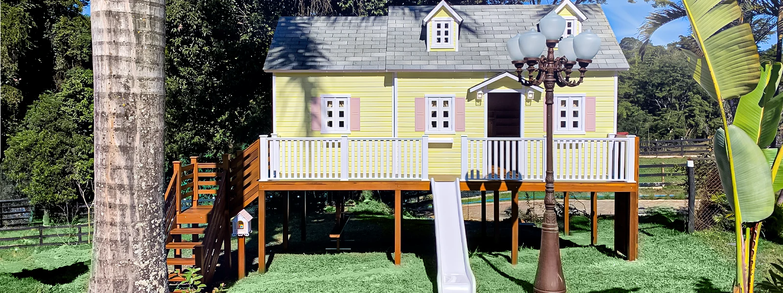 Lá no alto, a varanda acolhedora vira palco de histórias inventadas na hora, enquanto o escorregador chama os pequenos a descer e começar tudo de novo.